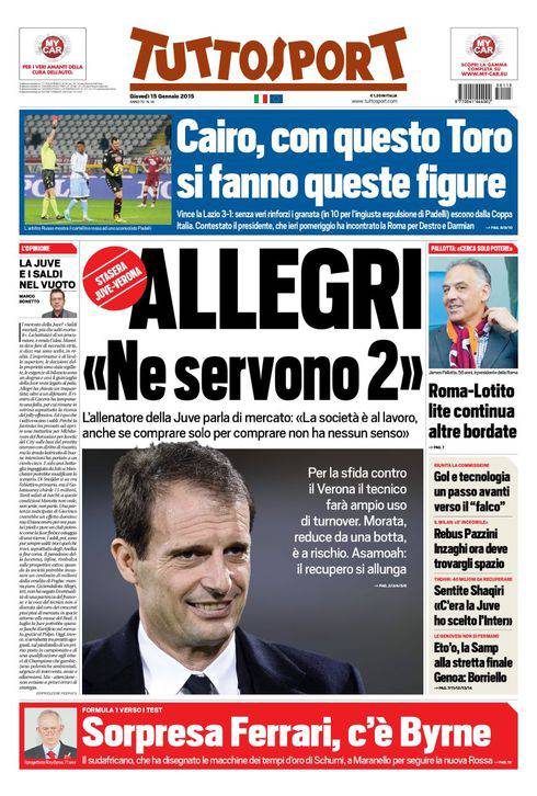 Il tecnico della Juventus Allegri chiede almeno due rinforzi alla società per poter rinforzare a dovere la Juventus.