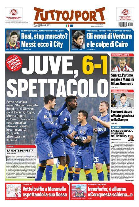 Festa del calcio in uno Stadium esaurito: doppietta di Giovinco, gol di Pereyra, Pogba e comani. I bianconeri che domenica ritrovano i veneti in campionato, nei quarti affronteranno il Parma. Real: stop mercato? Messi: ecco il City.