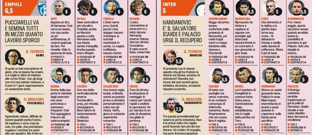 Queste le pagelle della Gazzetta dello Sport di Empoli-Inter. Malissimo Icardi, il peggiore fra i nerazzurri (5 per lui). Handanovic tiene a galla i nerazzurri (7,5). Deludono sia Shaqiri (5,5) che Podolski (5). Nell’Empoli il peggiore è Verdi (5). Il migliore invece Pucciarelli (7).