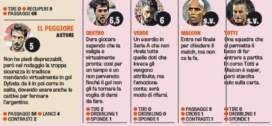 Queste le pagelle della Gazzetta dello Sport (a firma di Massimo Cecchini) relative alla partita fra Palermo e Roma finita 1-1. Fra i giallorossi il migliore è Strootman, decisivo in occasione del pareggio di Destro. Il peggiore invece è Astori.