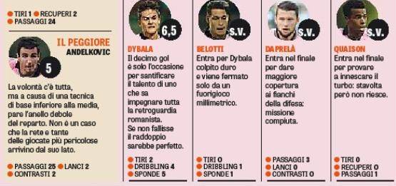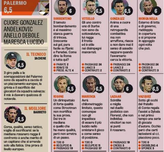 Fra i rosanero il migliore è invece Barreto (6,5 per lui). Il peggiore è Andelkovic (5), che, secondo il giornalista, ha una tecnica di base inferiore rispetto ai compagni di reparto.