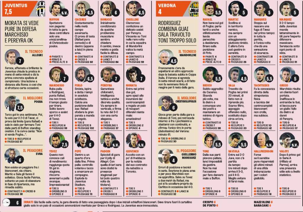 La Juventus ha travolto quattro a zero il Verona, dopo il sei a uno in Coppa Italia. Pogba ancora una volta protagonista con un gol bellissimo e una partita da top player. La standing ovation dello Juventus Stadium è tutta per il francese che vuole continuare a fare bene. Pogba assistito da un Tevez sempre più capocannoniere che con la doppietta vola a 13 reti in campionato. Nel Verona disastroso di Mandorlini ci prova solo Toni che però è molto isolato in avanti, bene anche Lazaros mentre la difesa balla spaventosamente. Voti e pagelle della Gazzetta dello Sport.
