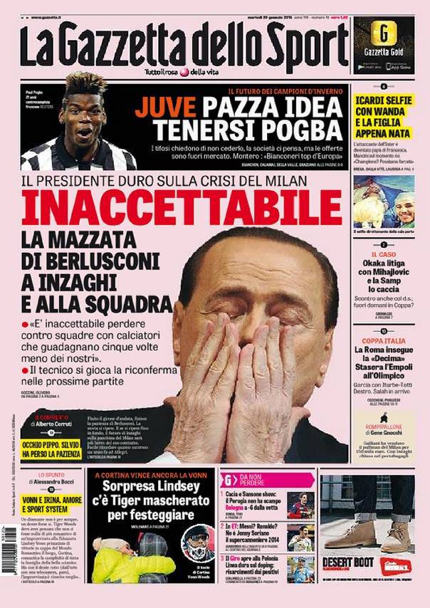 La mazzata di Berlusconi a Inzaghi e alla squadra. “E’ inaccettabile perdere contro squadre con calciatori che guadagnano cinque volte meno dei nostri”. Il tecnico si gioca la riconferma nelle prossime tre partite. Juve, pazza idea: tenersi Pogba.