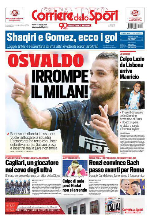 Corriere dello Sport – Osvaldo, irrompe il Milan 22/01/2015 di Ruggieri Il Corriere dello Sport parla della vicenda Osvaldo sospeso dall’Inter e con il Milan pronto a prenderlo subito. Samuele Roccati