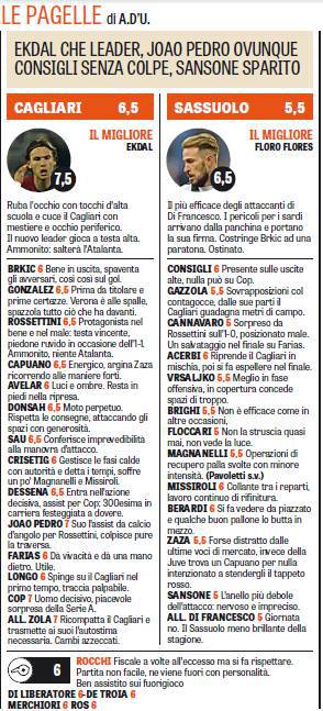 La cura di Gianfranco Zola sembra funzionare per il Cagliari che si è già rimesso in corsa per la permanenza in serie A mettendosi alle spalle Chievo, Cesena e Parma. Davanti al proprio pubblico, la squadra sarda, grazie al primo gol italiano di Cop condanna il peggior Sassuolo della stagione. Bella prova di tutta la squadra rossoblù come si evince dai voti della Gazzetta dello Sport. Il migliore in assoluto è stato Ekdal, vero leader della squadra di Zola. Gioca a testa alta e regala tocchi d’alte classe trascinando il gruppo verso una vittoria importantissima. Irriconoscibile, invece, il Sassuolo di Eusebio Di Francesco in cui la palma di migliore va a Floro Flores, l’unico in grado di creare pericoli veri ai sardi.
