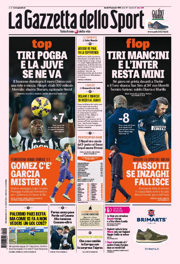 La Gazzetta dello Sport parla soprattutto dell’Inter che perde in casa contro il Torino per uno a zero. Mancini furioso.