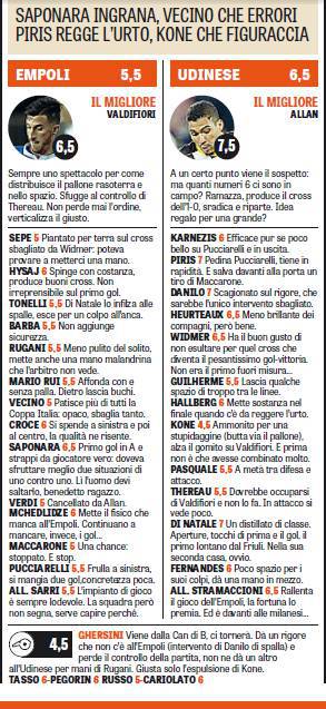 Nel posticipo della 20a giornata di serie A, l’Udinese di Andrea Stramaccioni trova tre punti importanti in trasferta battendo per 2-1 l’Empoli. I friulani condizionati da un arbitro che sbaglia tutto e da un cross di Widmer ce va dentro. Male i toscani in attacco. Nei voti e nelle pagelle della Gazzetta dello Sport, tra i bianconeri, il migliore è stato Allan, presente in tutte le zone del campo. Mal, invece, Kone. Nell’Empoli la palma di migliore va a Valdifiori, sempre uno spettacolo per come distribuisce il pallone nello spazio.