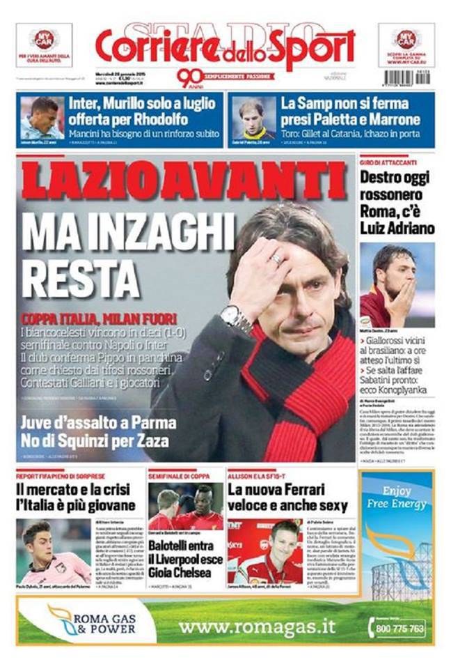 La Lazio vince in dieci per 1-0 eliminando il Milan. Semifinale contro Napoli o Inter.Il club rossonero conferma Inzaghi in panchina come chiesto dai tifosi rossoneri. Contestati Galliani e alcuni giocatori. Destro oggi rossonero, Roma, c’è Luiz Adriano.