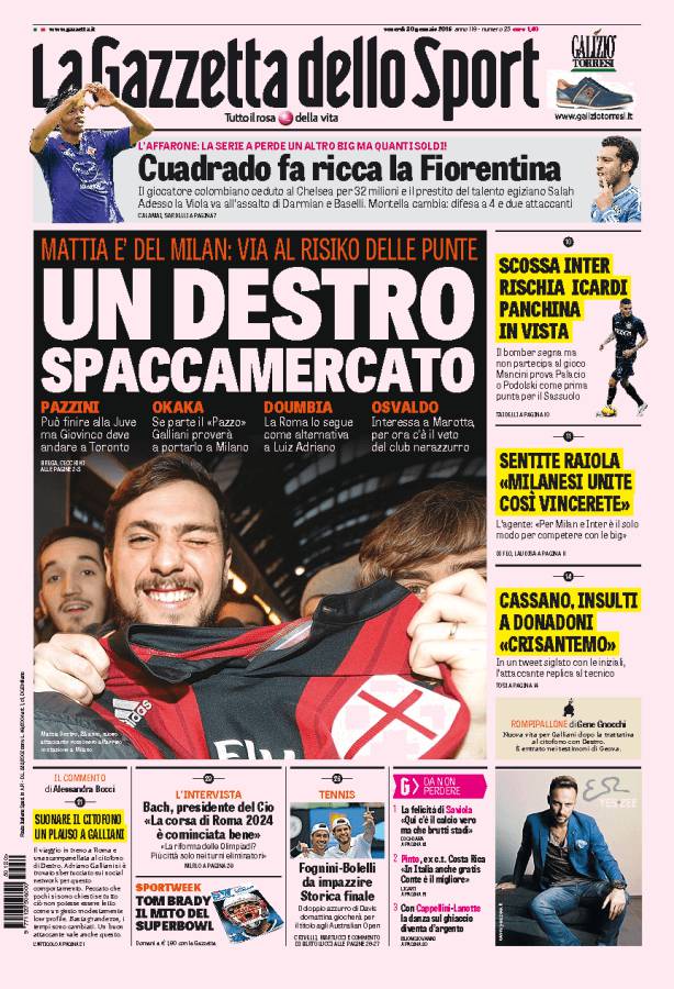 La Gazzetta dello Sport parla di Mattia Destro che è approdato al Milan e ha dato vita a un giro di punte importanti.