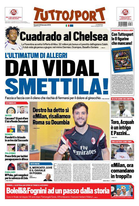 Su Tuttosport si parla di Vidal che ha avuto un ultimatum da Allegri. Il cileno intanto rischia di fermarsi per il dolore al ginocchio.