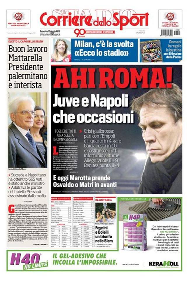 Crisi giallorossa: pari con l’Empoli, è il quarto in quattro gare. Garcia resta in dieci e sostituisce Totti. Infortunio a Iturbe. Allegri vuole il +9, Benitez il -4. E oggi Marotta prende Osvaldo o Matri in avanti. Milan, c’è la svolta: ecco lo stadio.