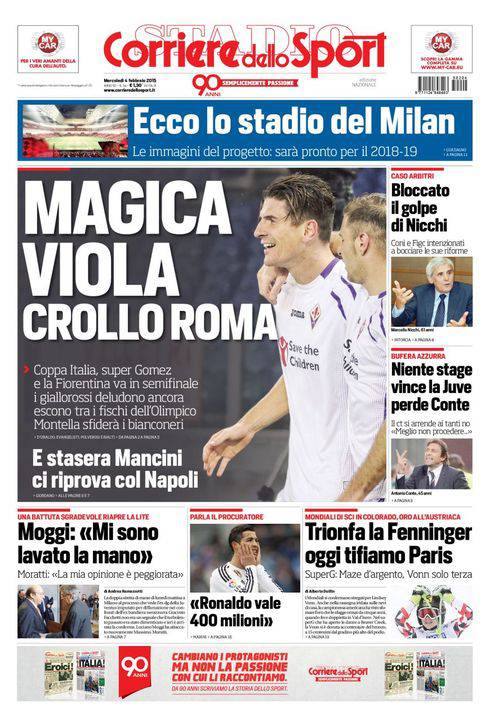Corriere dello Sport – Magica Viola crollo Roma 04/02/2015 di Ruggieri Il Corriere dello Sport parla invece della Fiorentina che vince due a zero a Roma nei quarti di Coppa Italia e vola in semifinale. Altra delusione per i giallorossi. Samuele Roccati