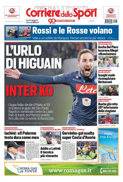 Il Corriere dello Sport parla del gol di Higuain al 93esimo minuto che manda il Napoli in semifinale di Coppa Italia ed elimina l’Inter di Mancini.
