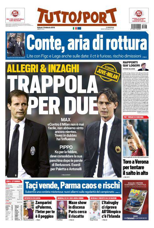 Su Tuttosport si parla del match di questa sera tra Juventus e Milan, Allegri ha parlato di match difficile, Inzaghi vuole i tre punti.