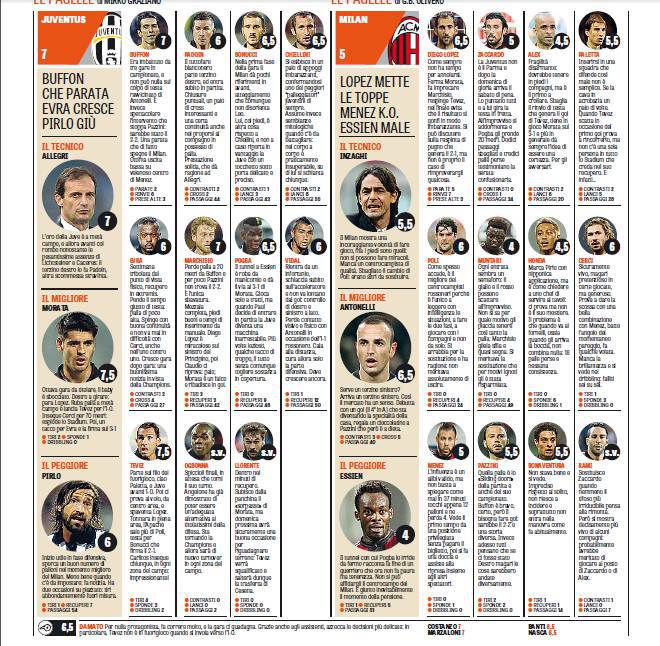 Partita straordinaria della Juventus di Massimiliano Allegri che, ancora una volta, ha dato una grande dimostrazione di forza. Allo Stadium non c’è stata partita: una Juve determinata e orgogliosa ha battuto per 3-1 un Milan che è rimasto a galla per un tempo grazie al pareggio di Antonelli e alle parate di Diego Lopez. Nei voti e nelle pagelle della Gazzetta dello Sport, tutti promossi i bianconeri. Il migliore è stato Alvaro Morata, preferito a Fernando Llorente: il giovane attaccante spagnolo mostra tutto il suo talento. Destro a giro ma Lopez para fino al 3-1 definitivo. Scende, invece, Andrea Pirlo, utile in fase difensiva ma sporca qualche pallone di troppo. Nel Milan, invece, il migliore è il neo acquisto Antonelli, con il gol nel dna mentre il peggiore è Essien, lontano dal guerriero che è stato.