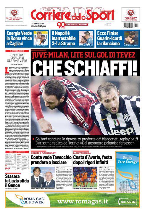 Il Corriere dello Sport parla della polemica tra Juventus e Milan per il gol di Tevez in presunto fuorigioco.