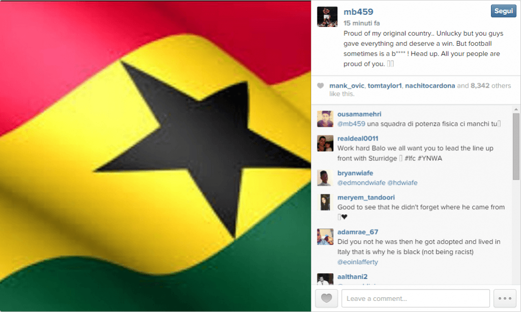 Mario Balotelli ha voluto commentare la sconfitta del Ghana nella finale di Coppa d’Africa persa contro la Costa d’Avorio. L’attaccante del Liverpool affida le sue parole a Instagram, postando l’immagine della bandiera del suo Paese di origine dichiarando: ‘Sono orgoglioso del mio paese d’origine. Siete stati sfortunati, ma avete dato tutto e meritavate la vittoria. Il calcio a volte è str…! Camminate a testa alta, il vostro popolo è orgoglioso di voi‘.