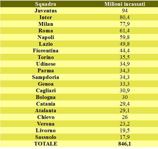 Che sia una coincidenza o meno, viste le furenti polemiche sulla gestione televisiva delle gare della Serie A di qualche ora fa, non è dato sapere, ma certo è che, proprio nelle scorse ore, sono saltate fuori le cifre incassate dai club italiani per i diritti TV della stagione 2013-2014. Come ormai sappiamo da diverso tempo, buona parte degli introiti dei club italiani, arrivano proprio dalla cessione dei diritti TV, e per questa ragione sono sempre infuocate le battaglie portate avanti in consiglio di Lega di Serie A per le ridistribuzioni dei milioni