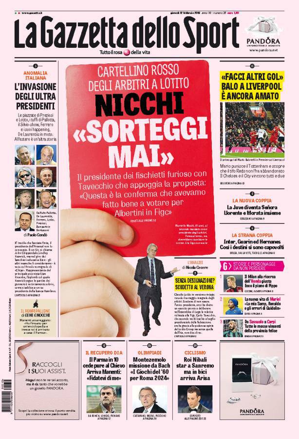 La Gazzetta dello Sport parla della risposta di Nicchi a Lotito riguardo al sorteggio che non avverrà più nei prossimi anni.