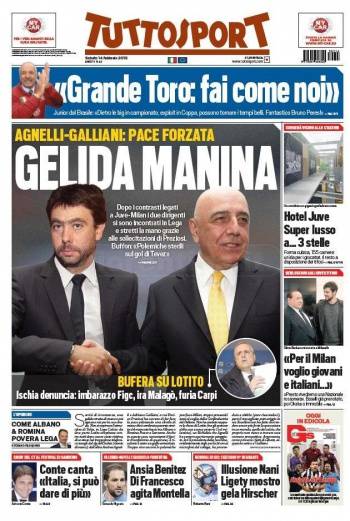 Tuttosport parla invece della stretta di mano tra Agnelli e Galliani che hanno firmato una specie di armistizio dopo le polemiche arbitrali.