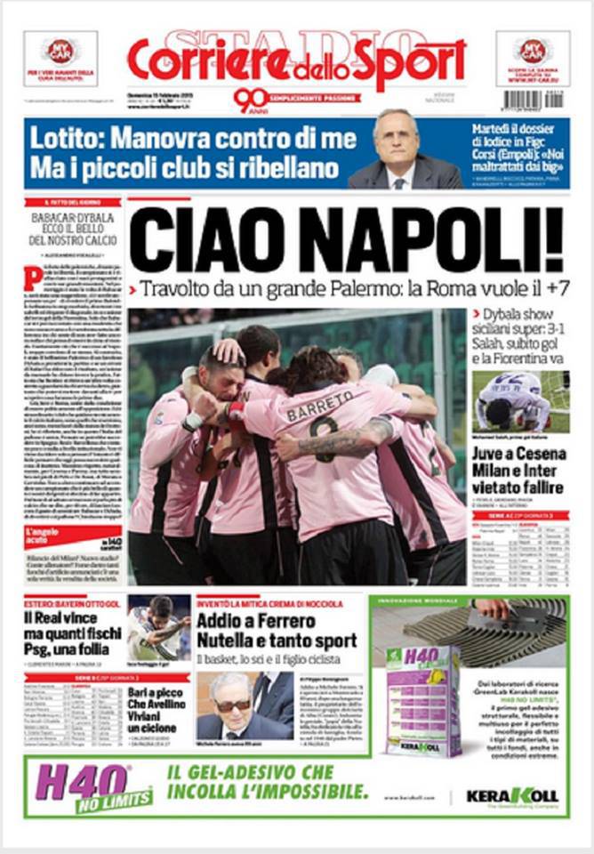 Napoli travolto da un grande Palermo. La Roma vuole il +7 sugli azzurri. Lotito: “Manovra contro di me”. Ma i piccoli club si ribellano. Juve a Cesena. Milan e Inter, vietato fallire.