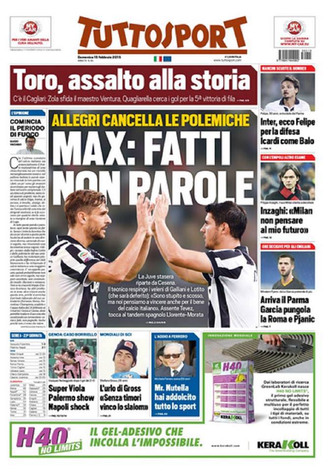 La Juventus stasera riparte da Cesena. Allegri respinge gli attacchi e i veleni di Galliani e Lotito: “Sono stupito e scosso ma noi pensiamo a vincere anche per il bene del calcio italiano”. Arriva il Parma: Garcia pungola la Roma e Pjanic. Inzaghi: “Milan, non pensare al mio futuro”.