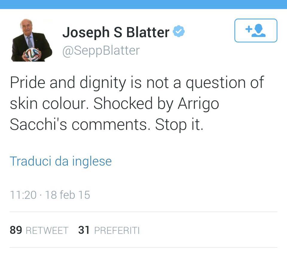 Non accennano a diminuire le polemiche per le recenti dichiarazioni di Arrigo Sacchi sulla presenza di extracomunitari nelle squadre italiane. Nonostante l’ex C.T. della Nazionale abbia tentato di correggere il tiro spiegando il senso delle sue parole, altri esperti del mondo del calcio hanno condannato le sue dichiarazioni. Dopo i tweet di Mino Raiola, anche il presidente della Fifa, Blatter, attraverso il suo profilo Twitter ha condannato quanto detto da Sacchi. “L’orgoglio e la dignità non dipendono dal colore della pelle. Sono scioccato dai commenti di Arrigo Sacchi”, ha scritto il numero uno della Fifa.