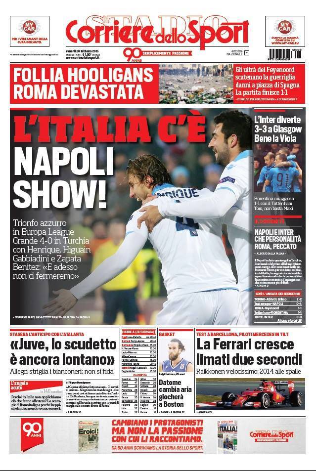 Trionfo azzurro in Europa League. grande 4-0 in Turchia con Henrique, Higuain, Zapata e Gabbiadini. Benitez: “E adesso non ci fermeremo”. Folia hooligans, Roma devastata. La partita finisce 1-1.