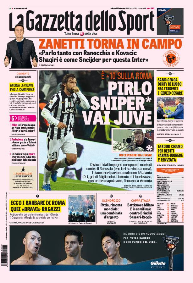 La Gazzetta dello Sport parla di Andrea Pirlo autore del gol vittoria nel match di ieri tra Juventus e Atalanta.