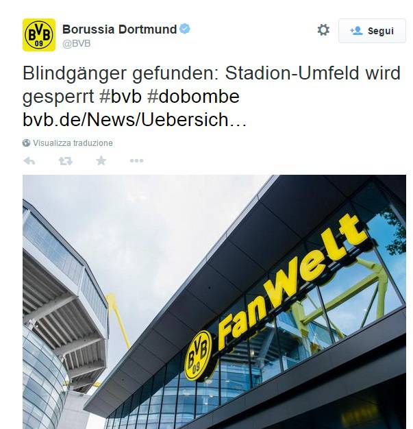 Tanta paura per il Borussia Dortmund ma anche per la Juventus. Già, perché nei pressi dello stadio in cui i bianconeri dovranno disputare il ritorno degli ottavi di finale di Champions League è stata trovata una bomba. La zona è stata immediatamente evacuata. Questo il comunicato della società giallonera su Twitter: ‘A causa di una boma rivenuta nei pressi dello stadio la conferenza di Jurgen Klopp non avrà luogo nella sala stampa del Signal Iduna Park alle 13 e 30, ma al centro tecnico di Brackel alle 14‘. L’allenatore tedesco avrebbe dovuto tenere la conferenza stampa per la vigilia del derby contro lo Schalke 04.