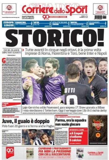 Il Corriere dello Sport parla dell’impresa delle cinque italiane impegnate in Europa League che passano il turno e si qualificano agli ottavi di finale.