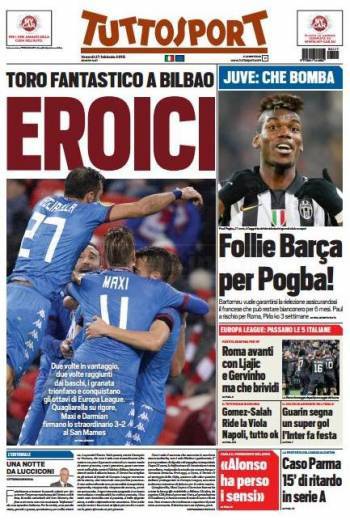 Su Tuttosport si parla dell’impresa del Torino che vince tre a due al San Mames, una vittoria storica per il calcio italiano.