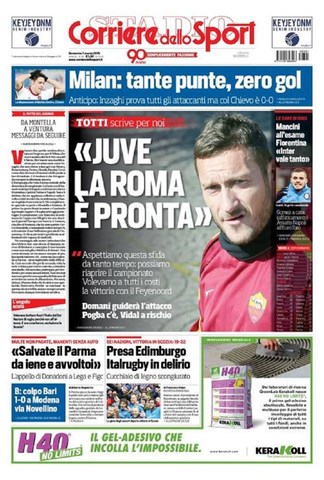 Francesco Totti scrive: “Aspettiamo questa sfida da tanto tempo. Possiamo riaprire il campionato. Volevamo a tutti i costi la vittoria con il Feyenoord”. Milan, tante punte, zero gol. Mancini all’esame Fiorentina.