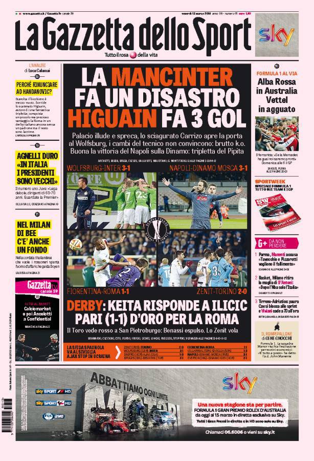 La Gazzetta dello Sport parla dell’Inter che prende tre sberle a Wolfsburg e Higuain che sigla tre gol importanti.