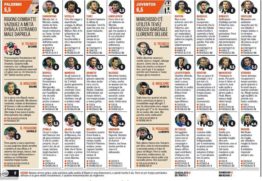 Con una magia di Alvaro Morata, già in versione Champions League, la Juventus batte il Palermo di Iachini portandosi a +14 sulla Roma e dando un ulteriore scatto verso la conquista del quarto scudetto consecutivo. Non una prestazione eccellente quella della squadra di Massimiliano Allegri ma è bastato il tocco magico di uno dei suoi campioni per portare a casa la vittoria. Proprio Morata, nel voti della Gazzetta dello Sport, è il migliore della squadra bianconera: non solo segna la rete della vittoria ma partecipa al gioco e aiuta anche in difesa. Nel Palermo, invece, il voto più alto va a Rigoni mentre non è una gran serata per i gioielli Dybala e Vazquez.
