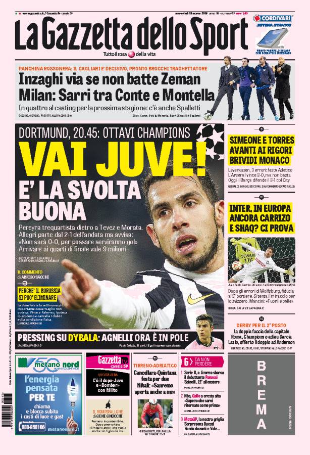 La Gazzetta dello Sport parla della Juventus che questa sera affronterà in Champions il Borussia Dortmund nel ritorno degli ottavi di finale.