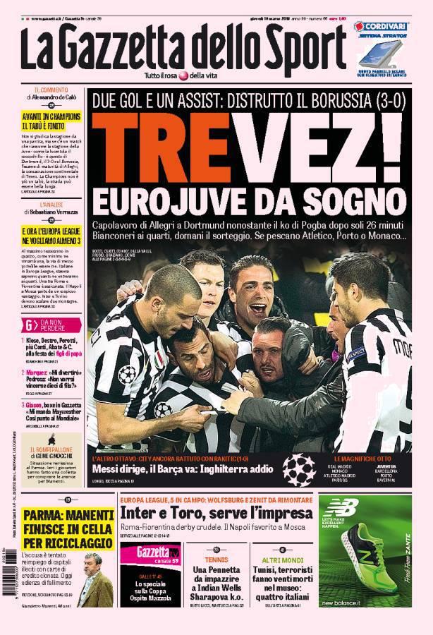 La Gazzetta dello Sport parla della Juventus che vince tre a zero a Dortmund e vola ai quarti di finale di Champions League.