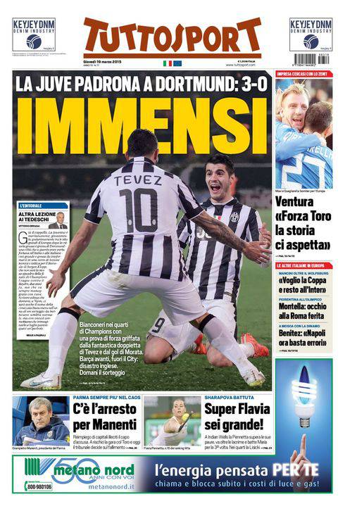 Juventus immensa per Tuttosport. I bianconeri volano ai quarti di finale di Champions League dopo il tre a zero al Borussia Dortmund.
