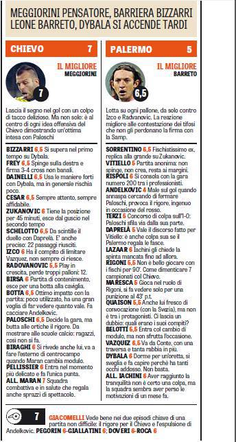 Il Chievo si avvicina alla salvezza grazie all’importantissima vittoria ottenuta nell’anticipo della 28esima giornata di Serie A. Al Bentegodi, la squadra di Maran, batte il Palermo di Iachini grazie ad una rete di Paloschi che, ormai, non si ferma più. Nei voti e nelle pagelle della Gazzetta, la palma di migliore, però, va a Meggiorini che lascia il segno nel gol della vittoria con un colpo di tacco delizioso. Nel Palermo, invece, il voto più alto va a Barreto, vero lottatore su ogni pallone.
