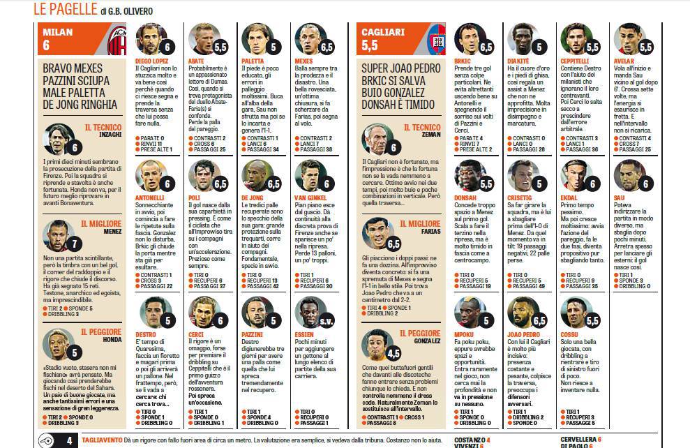 Il Milan salva la panchina di Pippo Inzaghi battendo in un San Siro quasi deserto per lo sciopero dei tifosi il Cagliari di Zeman con la doppietta di Menez e la rete di Mexes. I due francesi sono le cose belle del Milan di Inzaghi. Menez, il migliore della serata nei voti della Gazzetta, oltre alla doppietta, crea alcune occasioni e aiuta anche in fase di copertura. Mexes, invece, balla sempre tra la prodezza e il disastro e come ciliegina sulla torta segna al volo. Nel Cagliari, invece, il migliore è stato senza dubbio Farìas che si prende gioco in più occasioni della retroguardia rossonera.