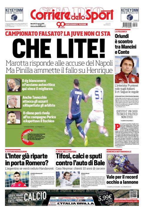 Il Corriere dello Sport parla della lite tra Napoli e Juventus riguardo il discorso campionato. Per i partenopei è falsato, la Juventus non ci sta.
