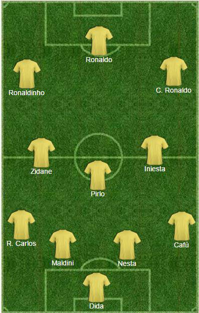 Una formazione davvero stellare quella scelta dall’ex rossonero che non poteva non inserire i compagni di tante vittorie, sia di nazionale, che di club. La difesa è davvero granitica con Dida tra i pali, Cafù e Roberto Carlos sulle fasce, e coppia centrale tutta italiana composta da Paolo Maldini ed Alessandro Nesta.