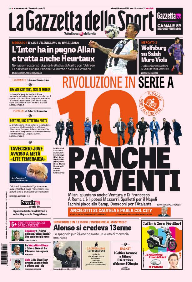 La Gazzetta dello Sport parla della possibile rivoluzione in Serie A per quanto riguarda le panchine di Serie A.