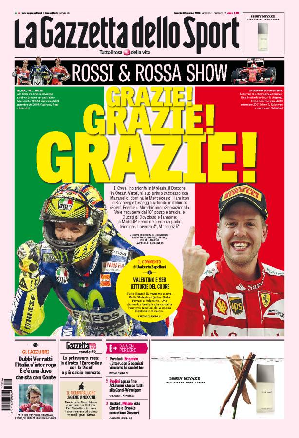 La Gazzetta dello Sport parla delle vittorie di Valentino Rossi e Sebastian Vettel che portano in alto i colori italiani.