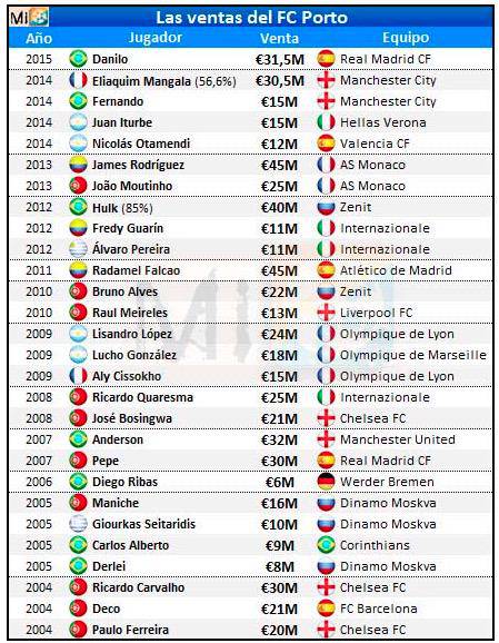 La cessione del laterale destro brasiliano Danilo al Real Madrid per la cifra di 31.5 milioni di euro, ufficializzata nella giornata di ieri, ha portato un po’ tutta la stampa sportiva ad interrogarsi: ma quanti milioni di euro, grazie alle sue vendite multimilionarie, ha collezionato il Porto negli ultimi anni? La società lusitana infatti, non è nuova ad acquistare calciatori per cifre irrisorie, e mandarli successivamente in giro per l’Europa, dopo averli ampiamente valorizzati, dietro il pagamento di somme stratosferiche. La risposta è arrivata, grazie ad uno studio condotto in Portogallo, ed è assolutamente sconvolgente: 600 milioni di euro. Ecco la grafica che dimostra, affare per affare, le cifre incassate dal club portoghese:
