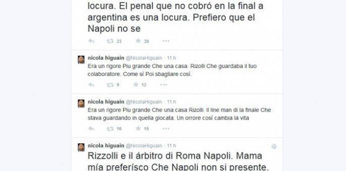 Nicola Rizzoli sarà l’arbitro che dirigerà Roma-Napoli, in programma domani 4 aprile allo stadio Olimpico alle 12.30. La designazione, però, non è affatto piaciuta a Nicola Higuain, fratello di Gonzalo il quale attraverso il suo profilo ‘Twitter’, ha lanciato un duro attacco: “Mi sembra una follia il fatto che Rizzoli arbitri Roma-Napoli. Il rigore che non fischiò a favore dell’Argentina nella finale è assurdo. Preferisco che il Napoli non si presenti, con gente che commette questi errori giocheremmo ancora una volta contro 14 avversari. Ormai è un’abitudine…”.