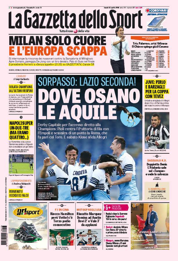 La Gazzetta dello Sport parla del sorpasso della Lazio nei confronti della Roma dopo la vittoria di ieri contro l’Empoli.