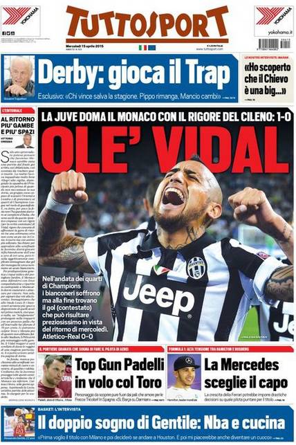 Tuttosport – Olé Vidal 15/04/2015 di Ruggieri Su Tuttosport si parla di Vidal che ha siglato il gol decisivo contro il Monaco su calcio di rigore contestato. Samuele Roccati