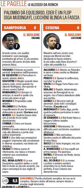 La Sampdoria di Sinisa Mihajlovic perde la grande occasione di rincorrere l’Europa. Contro il Cesena finisce solo 0-0. Le quattro punte non riescono a fondare il muro della squadra romagnola e dopo sei mesi i blucerchiati portano a casa un pareggio a reti bianche. Nei voti e nella Gazzetta dello Sport, il migliore della Samp è Obiang che riesce a dare personalità e voglia di are alla squadra. Nel Cesena, invece, il migliore è Lucchini, maetro dell’uno contro uno e bravo a stoppare sia Muriel che Eder.