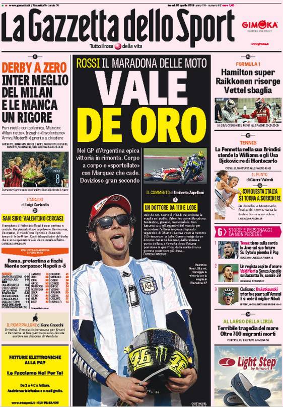 La Gazzetta dello Sport parla di Valentino Rossi che vince il Gp di Argentina e festeggia con la maglia di Maradona.